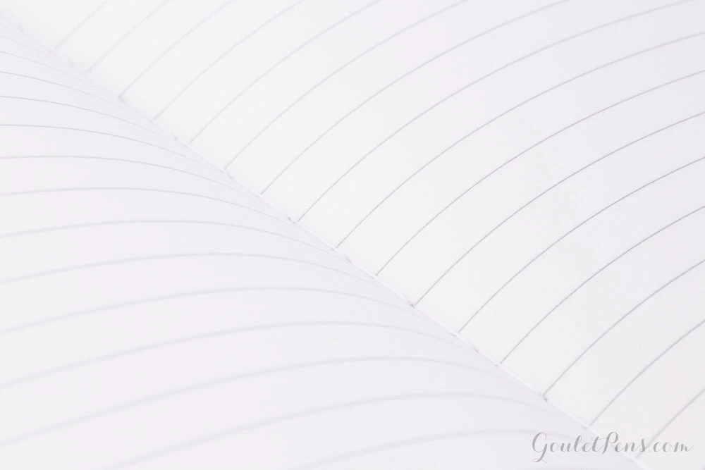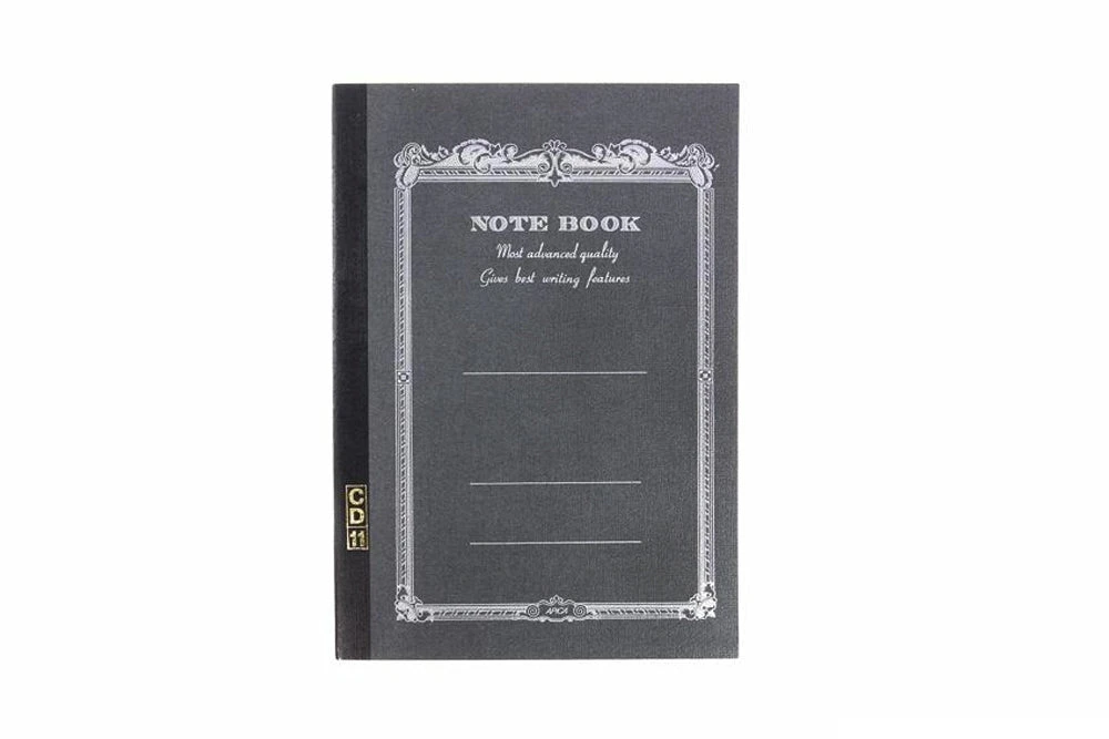 This A5-sized black notebook features 28 sheets (56 pages) of white super-smooth ruled paper and reinforced stitched binding. Each sheet has 25 lines, spaced 7mm apart, with a blank margin at the top.