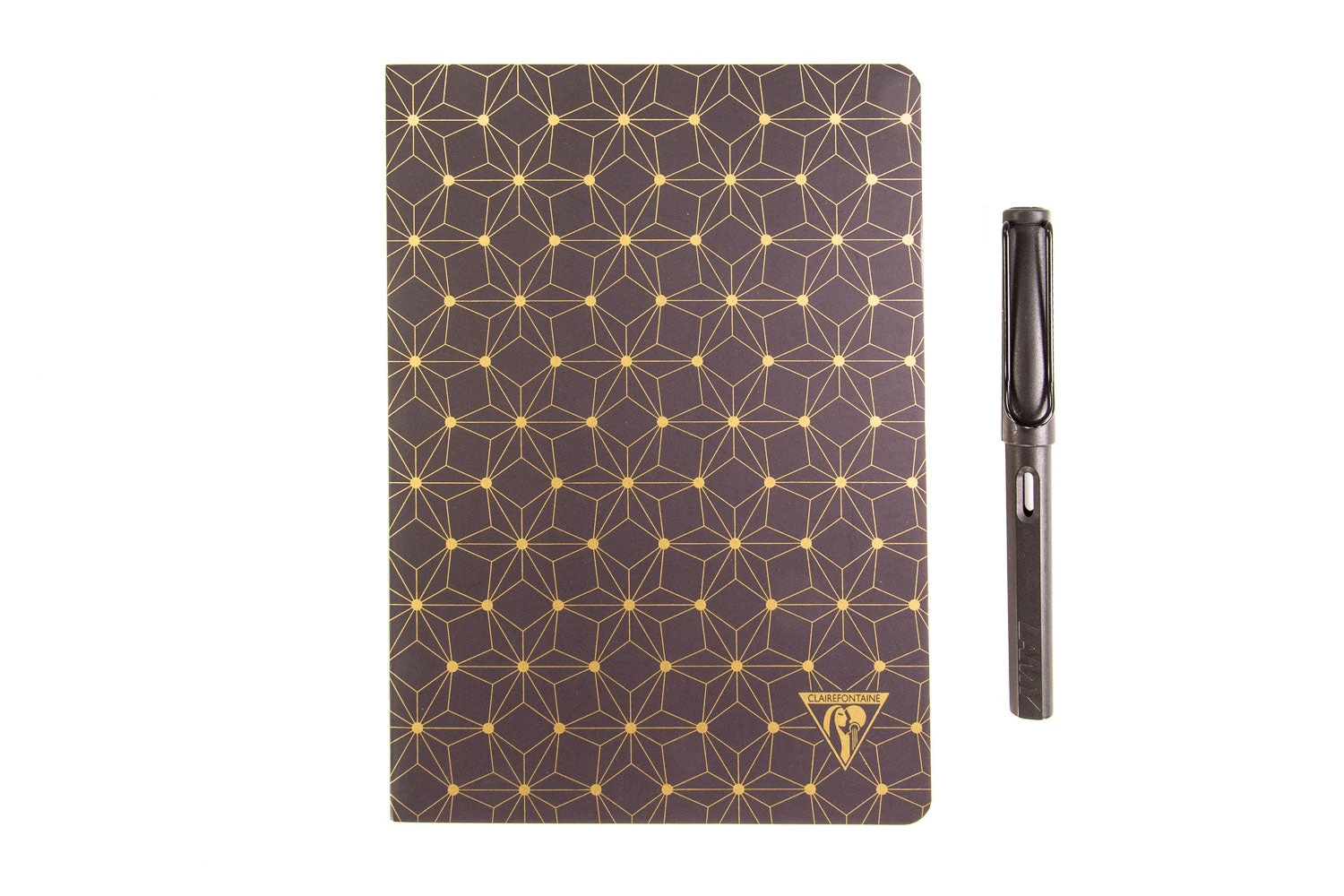 This Neo Deco themed A5-sized notebook features 48 sheets (96 pages) of super smooth ivory 90g Clairefontaine lined paper with a sewn spine binding. The cover is made of cardboard with a matte coating, finished with shiny gold printed accents.