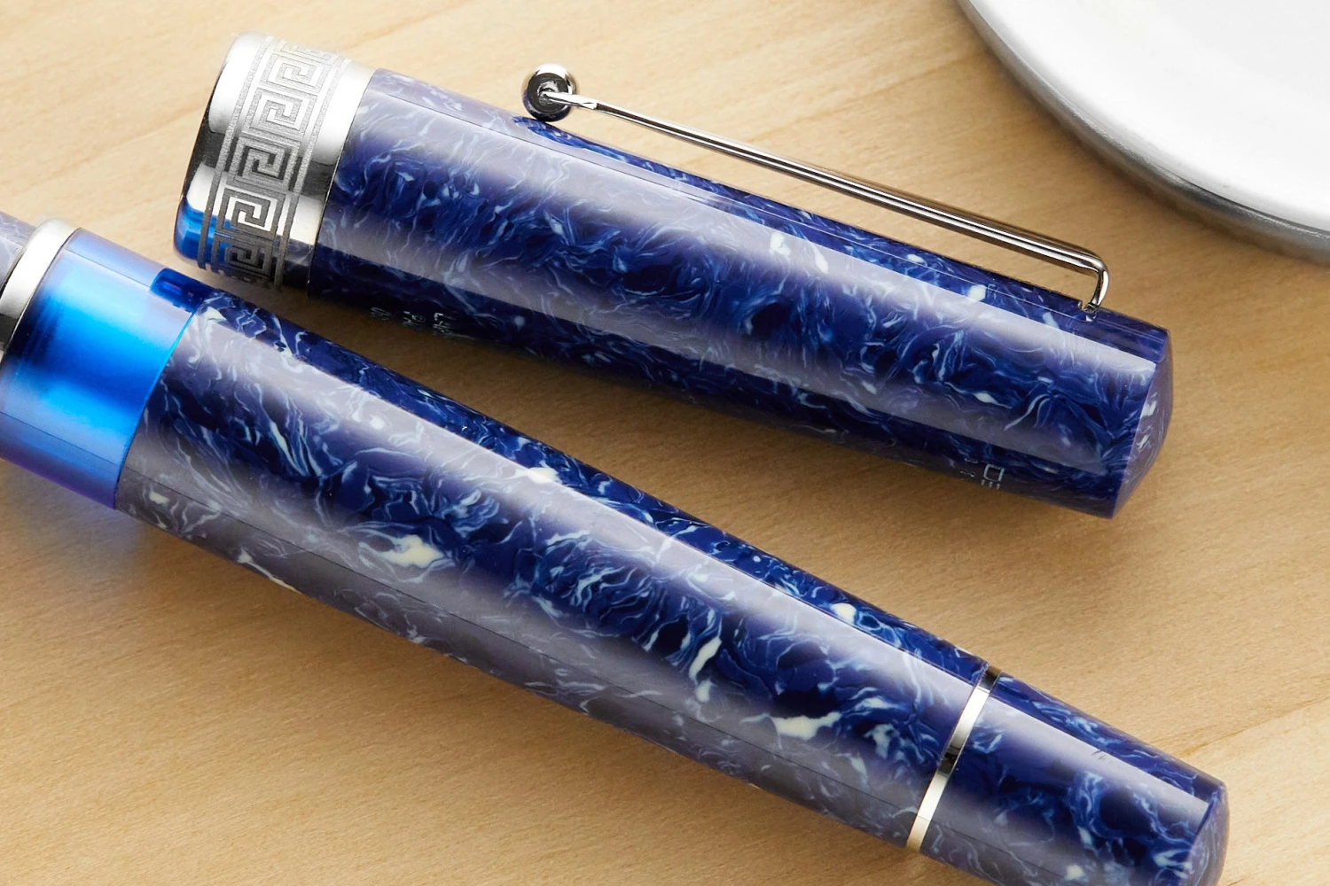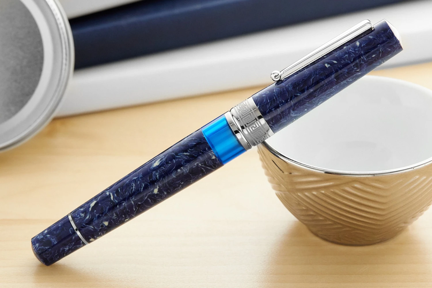 Made of a rare 30 year old lapis blue celluloid that is impossible to reproduce today, this fountain pen maintains many of the design cues familiar to fans of Delta from years past. From the Greek key mid-ring, the signature Delta roller-wheel style clip, to the smooth operating piston mechanism and ink view window, this limited edition speaks classic Delta.