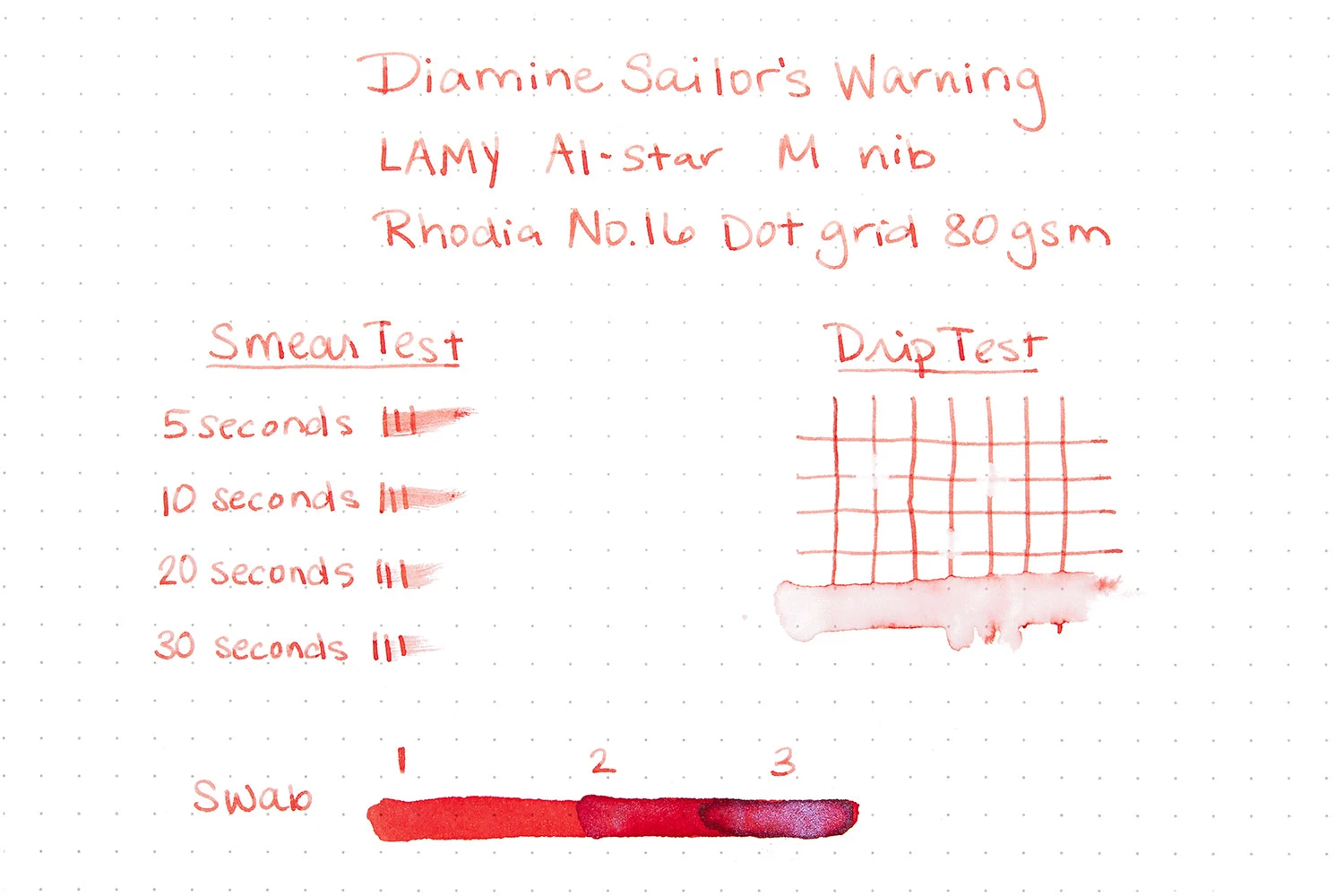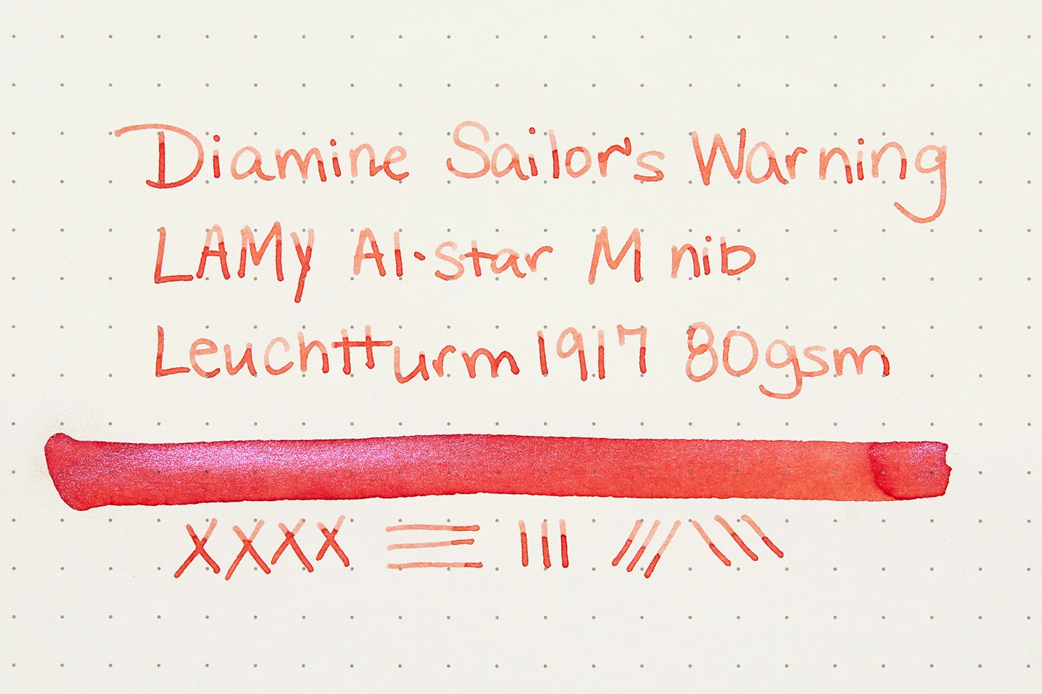 50ml glass bottle of Diamine Sailor’s Warning, a medium red ink with silver shimmer. Works best with broader nibs on high quality paper to really see the shine. This color was chosen by members of the /r/fountainpens reddit subcommunity.