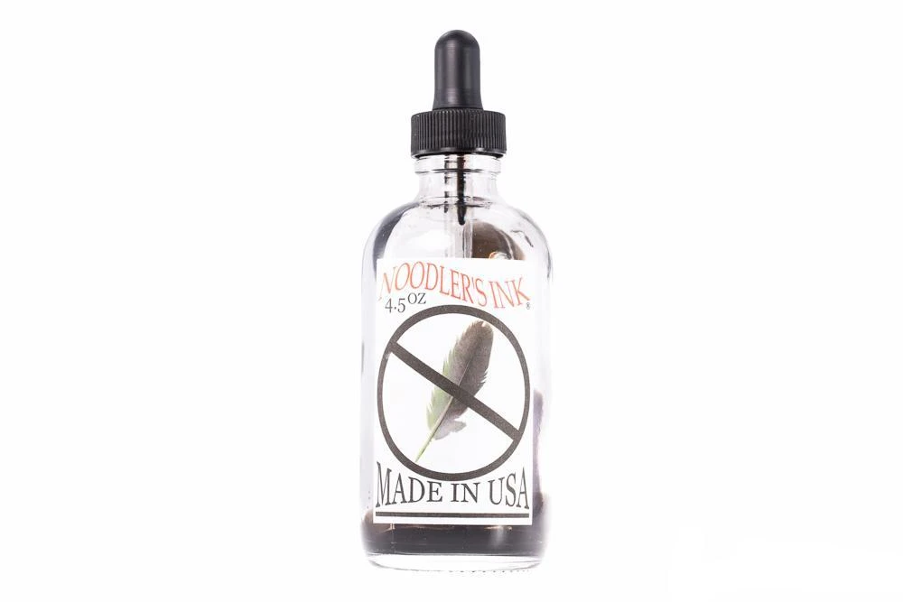 Empty 4.5oz (135ml) Noodler’s glass bottle with built-in eyedropper, not cleaned. We suggest using water (and ammonia or bleach if necessary) to give the bottle a thorough cleaning.