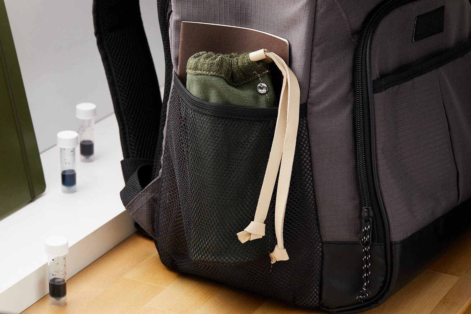 The bottom of the pen cup is flat; simply fold down the cover for desk display. Or, use the magnetic snap closure and cinch the leather drawstring closed to take your pens with you on the go.