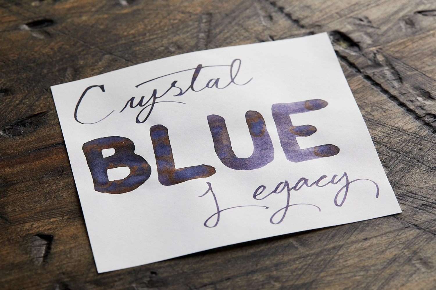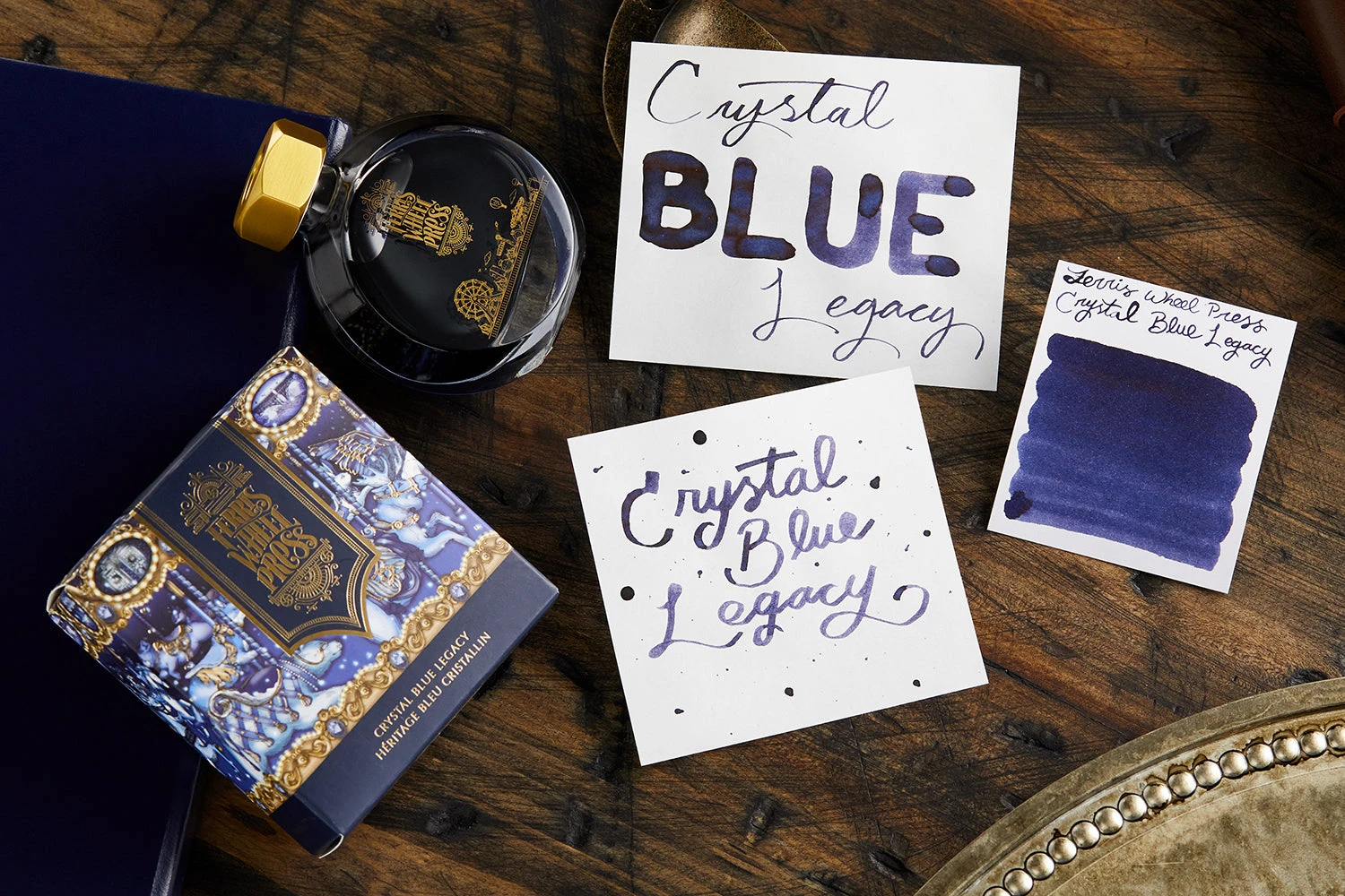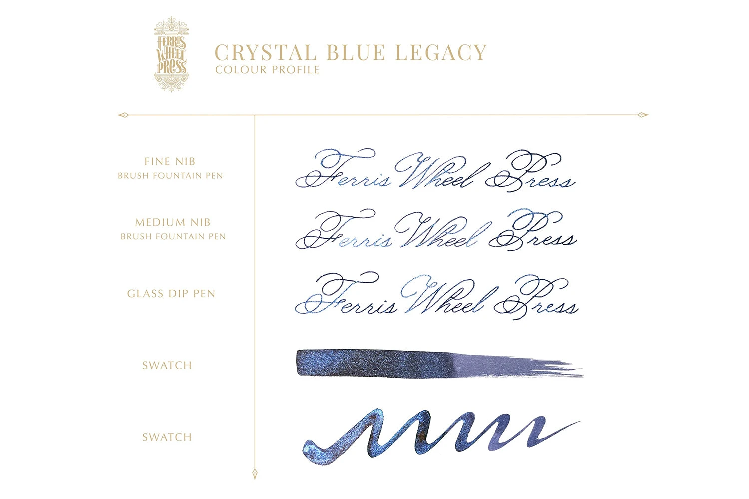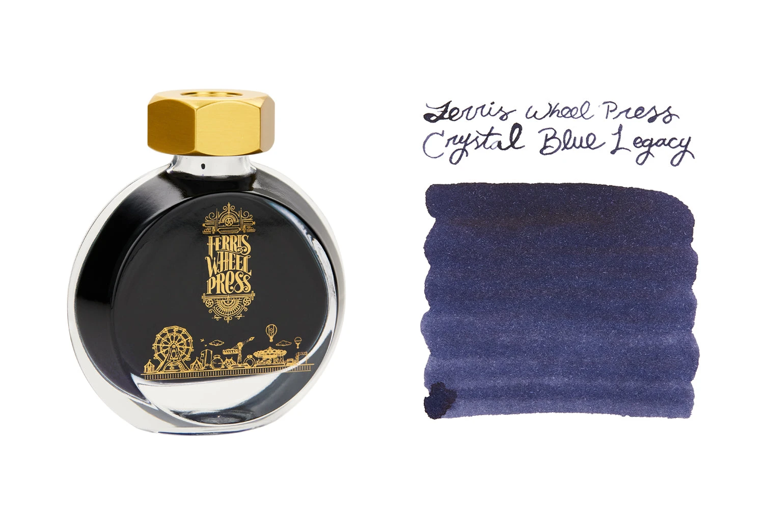 38ml glass bottle of Ferris Wheel Press Crystal Blue Legacy fountain pen ink, a classic navy blue with added blue shimmer. Limited edition color for 2024!