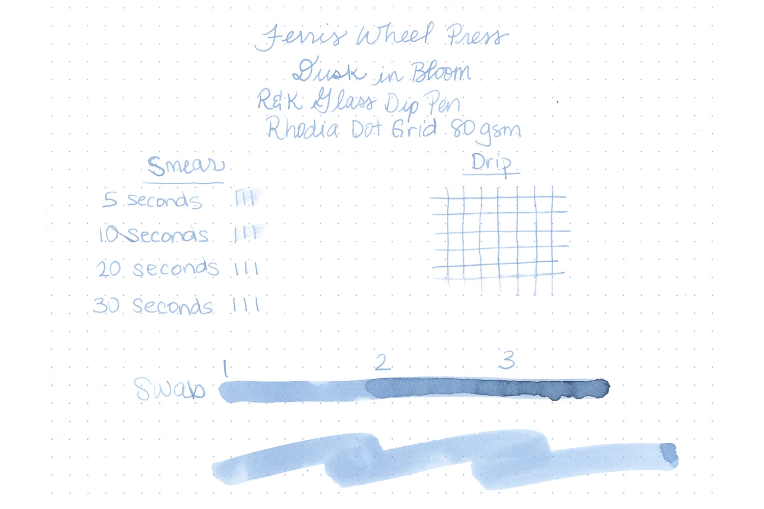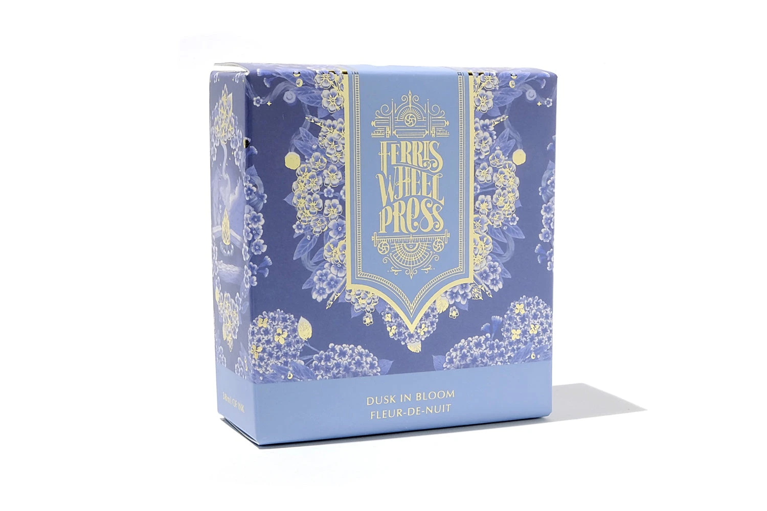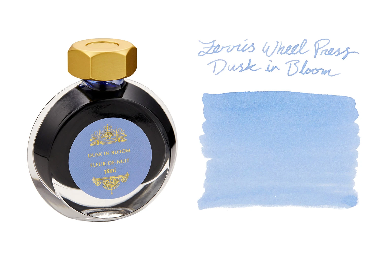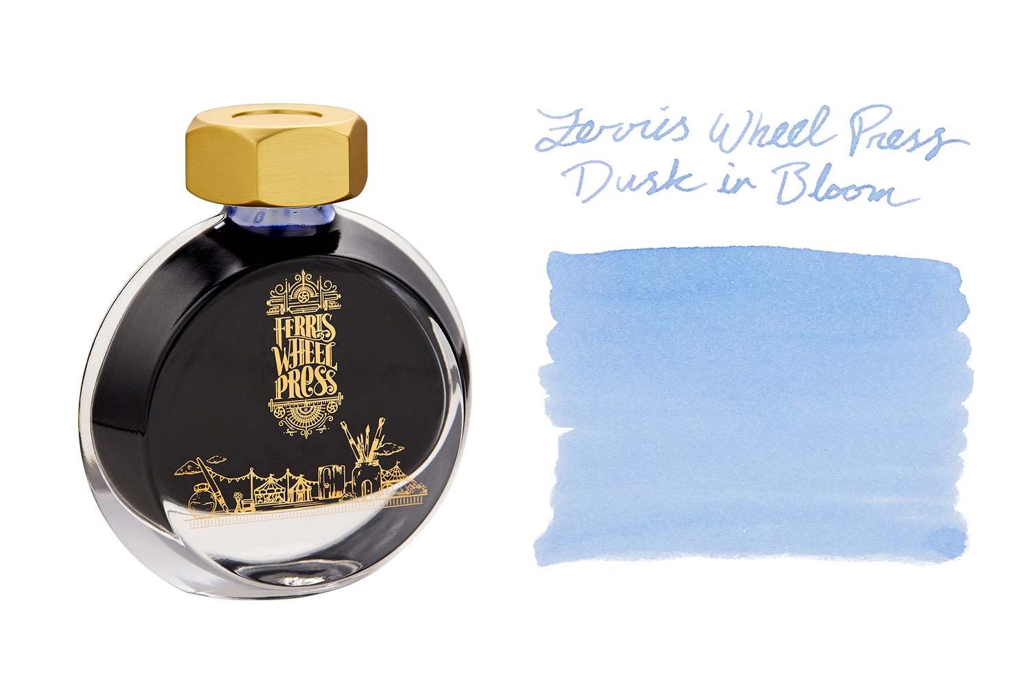 38ml glass bottle of Ferris Wheel Press Dusk in Bloom fountain pen ink, a periwinkle pastel blue color. Dusk in Bloom is part of the Twilight Garden collection.