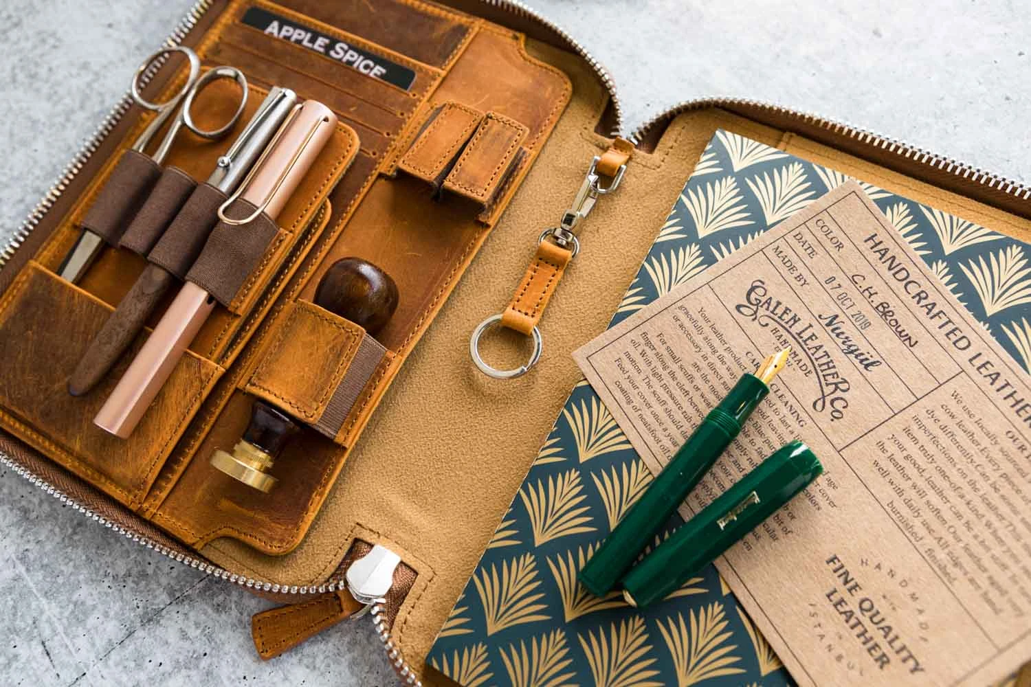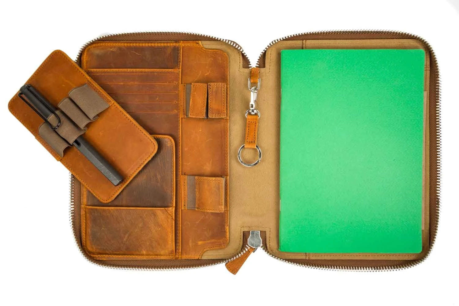 Save yourself the hassle of digging around your bag by keeping your valuables safe and secure in one place. This Galen Leather A5 zippered notebook folio is the perfect way to store your everyday essentials for work, study, or personal use. It has 4 credit card holders and a long pocket that keep your passport or your mobile phone. Under the left side, there is a sleeve for storing your iPad device. On the right, you can store a hard or soft cover A5 notebook. There are slots to support a sidebound or topbound notebook.