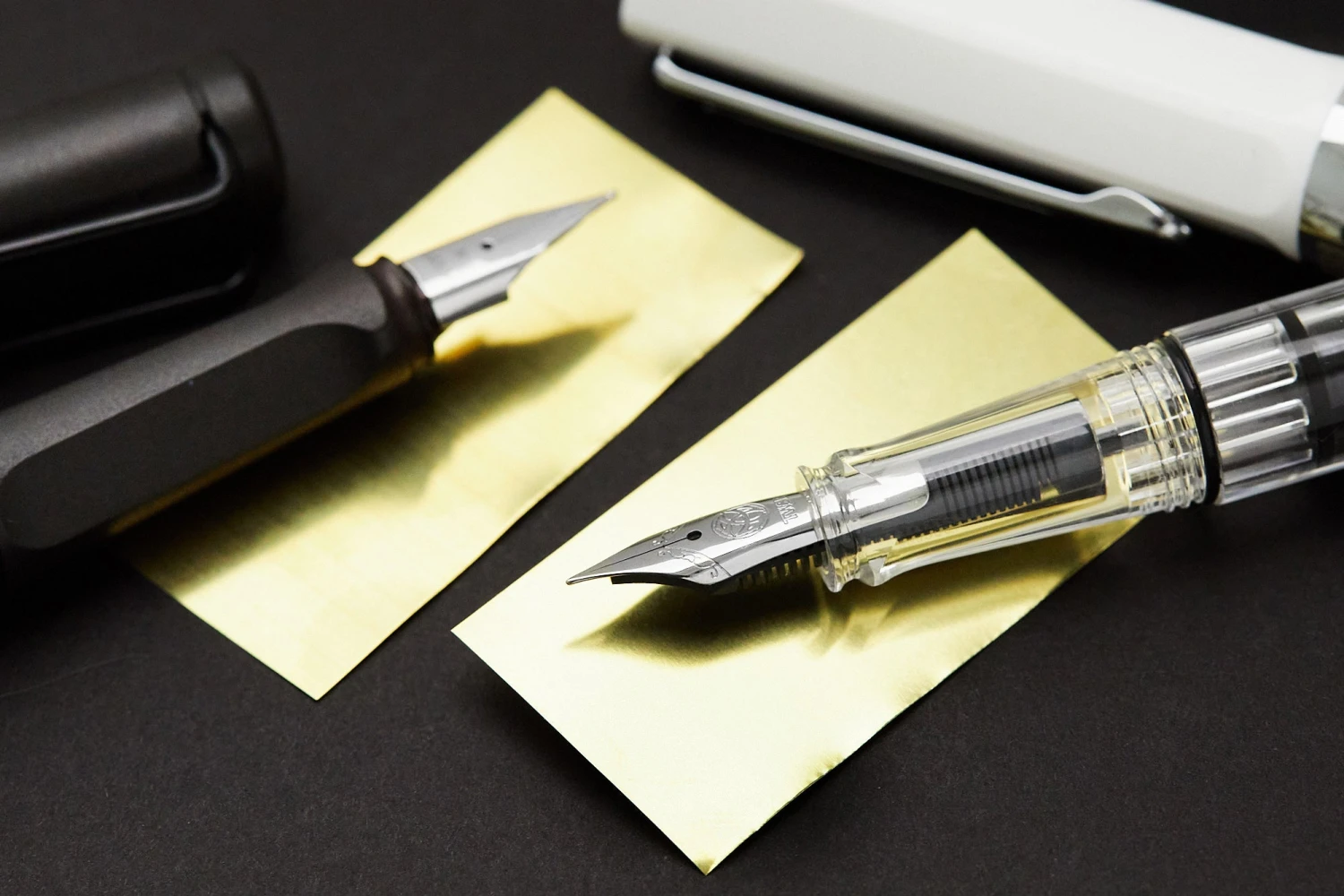 The brass sheets should be enough to last you quite some time if you’re careful. The brass is soft and can be bent fairly easily, but when that happens you can use a pair of household scissors and cut a small sliver off the end to reveal a fresh new edge to your brass. The reason the brass is so thin is so that it will easily fit between your tines without causing any pressure that would misalign the tines. Brass is the ideal material used for flossing nibs because it’s softer than any other metal used for making fountain pen nibs, so it won’t cause your nibs functional harm. There is a potential for the brass to scratch a nib with a colored coating on it (such as the LAMY or Monteverde Black nibs), so be careful when you’re using it on nibs like these that you don’t touch the brass to the nib surface.