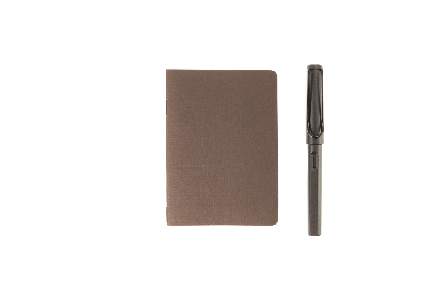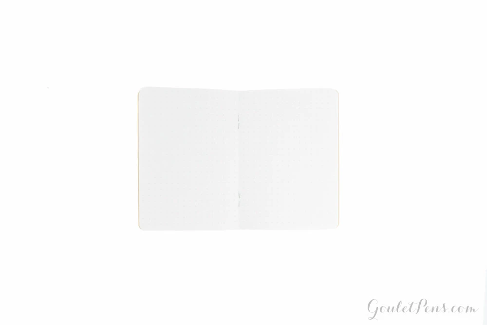 A Goulet Pens exclusive! This side stapled notebook features 32 sheets (64 pages) of white 68gsm fountain pen friendly dot grid Tomoe River paper, a dark brown 150g kraft paper cover printed with soy ink, rounded corners, and measures 8.9cm x 12.4cm (approximately 3.5in x 4.88in). Use it as a refill for inside your passport sized Traveler’s Notebook or as a standalone notebook. Great for bullet journaling!