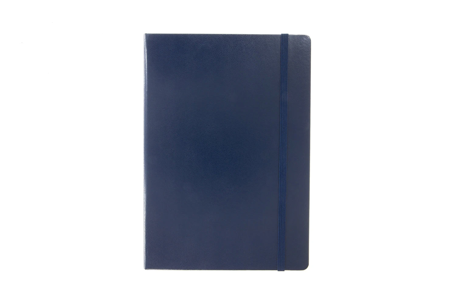 This medium A5-sized navy blue Leuchtturm1917 hardcover notebook is equally suited for the desk and for use on the move. It contains 249 numbered pages (125 sheets) of 5mm dot grid 80g ivory paper. Features include an expandable pocket, a blank table of contents, two ribbon page markers, elastic band fastener, stickers for labeling/archiving, and it opens flat.