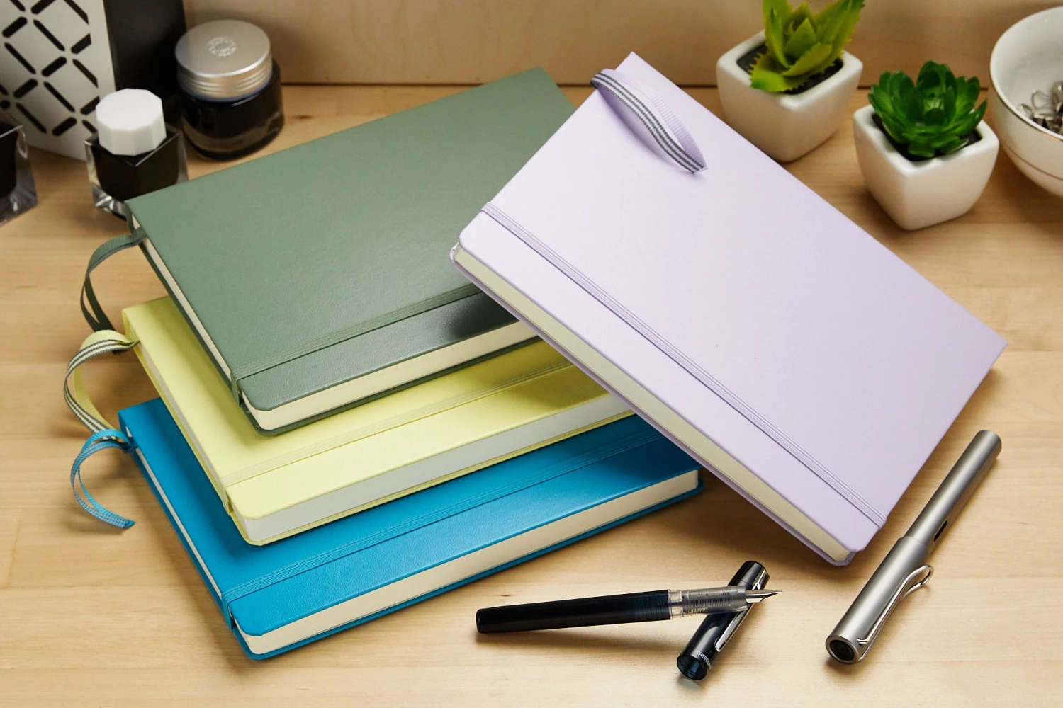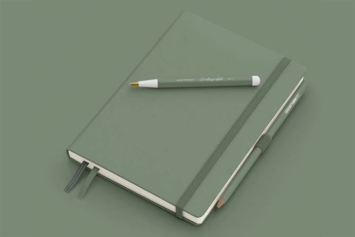 This medium A5-sized olive green Leuchtturm1917 hardcover notebook is equally suited for the desk and for use on the move. It contains 249 numbered pages (125 sheets) of 5mm dot grid 80g ivory paper. Features include an expandable pocket, a blank table of contents, two ribbon page markers, elastic band fastener, stickers for labeling/archiving, and it opens flat.
