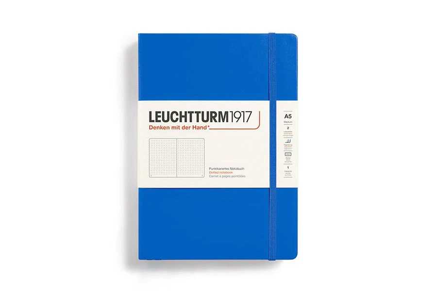 This medium A5-sized Sky blue colored Leuchtturm1917 hardcover notebook is equally suited for the desk and for use on the move. It contains 249 numbered pages (125 sheets) of 5mm dot grid 80g ivory paper. Features include an expandable pocket, a blank table of contents, two ribbon page markers, elastic band fastener, stickers for labeling/archiving, and it opens flat.