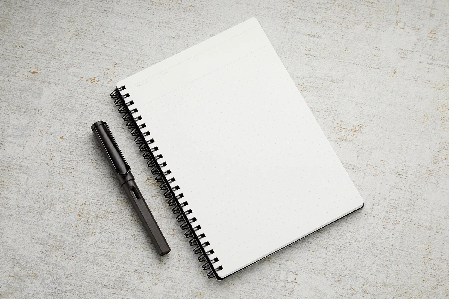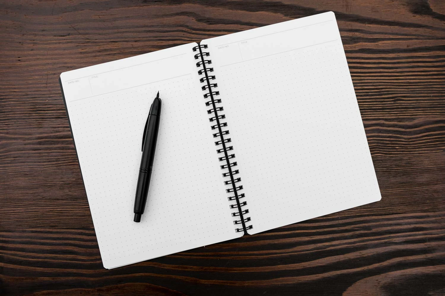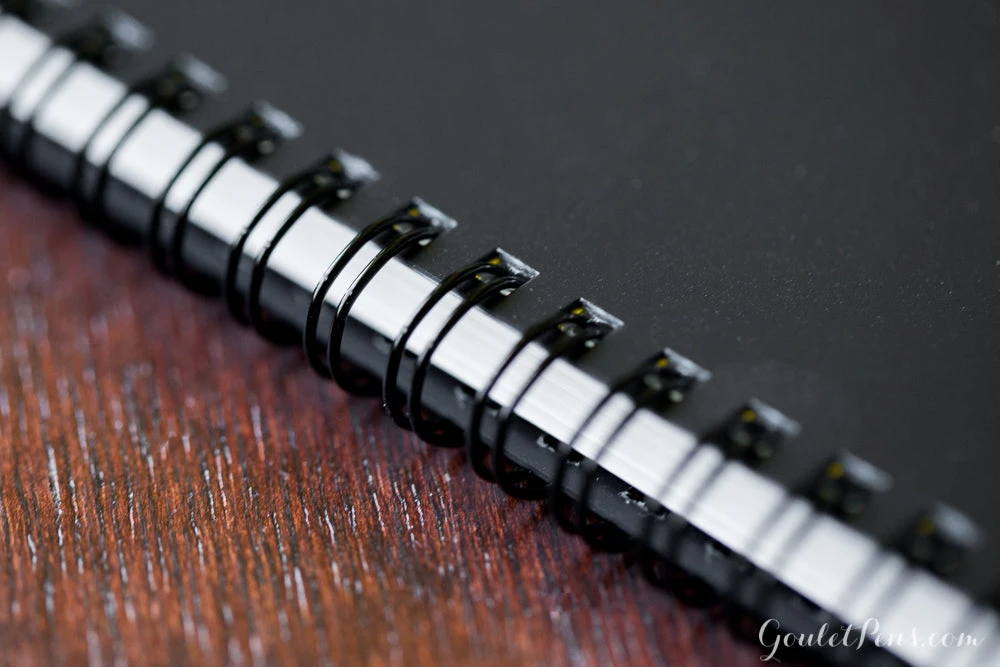 Made in Japan, this A5-sized notebook features 80 sheets of white acid-free 80gsm dot grid paper. The black double wire side spiral binding matches the black plastic cover. The notebook features dots spaced 5mm apart, and every page is micro-perforated. Each sheet contains a blank margin at the top with a space for the date and title.