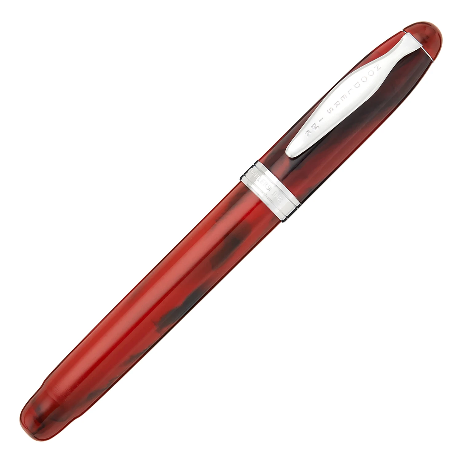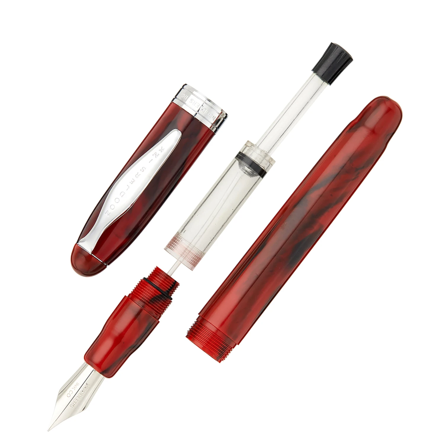 The Noodler’s Ahab flex pen features a steel flexible #6 nib and a slide piston mechanism. If you’d like, you can even remove the piston mechanism and use the pen as an eyedropper for a massive 6ml ink capacity. This red and black Ahab is made of a celluloid derivative and is technically biodegradable and formed from a “renewable resource”. The vegetal resin body of this pen may show particles or striations within the material. This is most noticeable in demonstrators and bright colors.