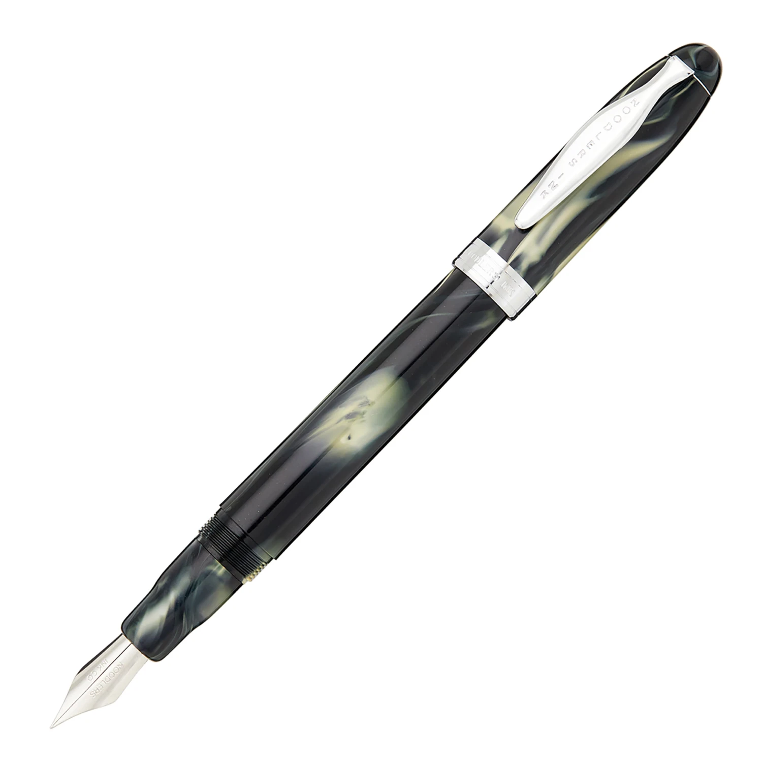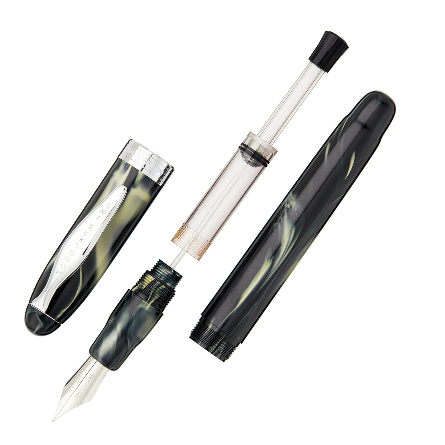 The Noodler’s Ahab flex pen features a steel flexible #6 nib and a slide piston mechanism. If you’d like, you can even remove the piston mechanism and use the pen as an eyedropper for a massive 6ml ink capacity. This white and black Ahab is made of a celluloid derivative and is technically biodegradable and formed from a “renewable resource”. The vegetal resin body of this pen may show particles or striations within the material. This is most noticeable in demonstrators and bright colors.