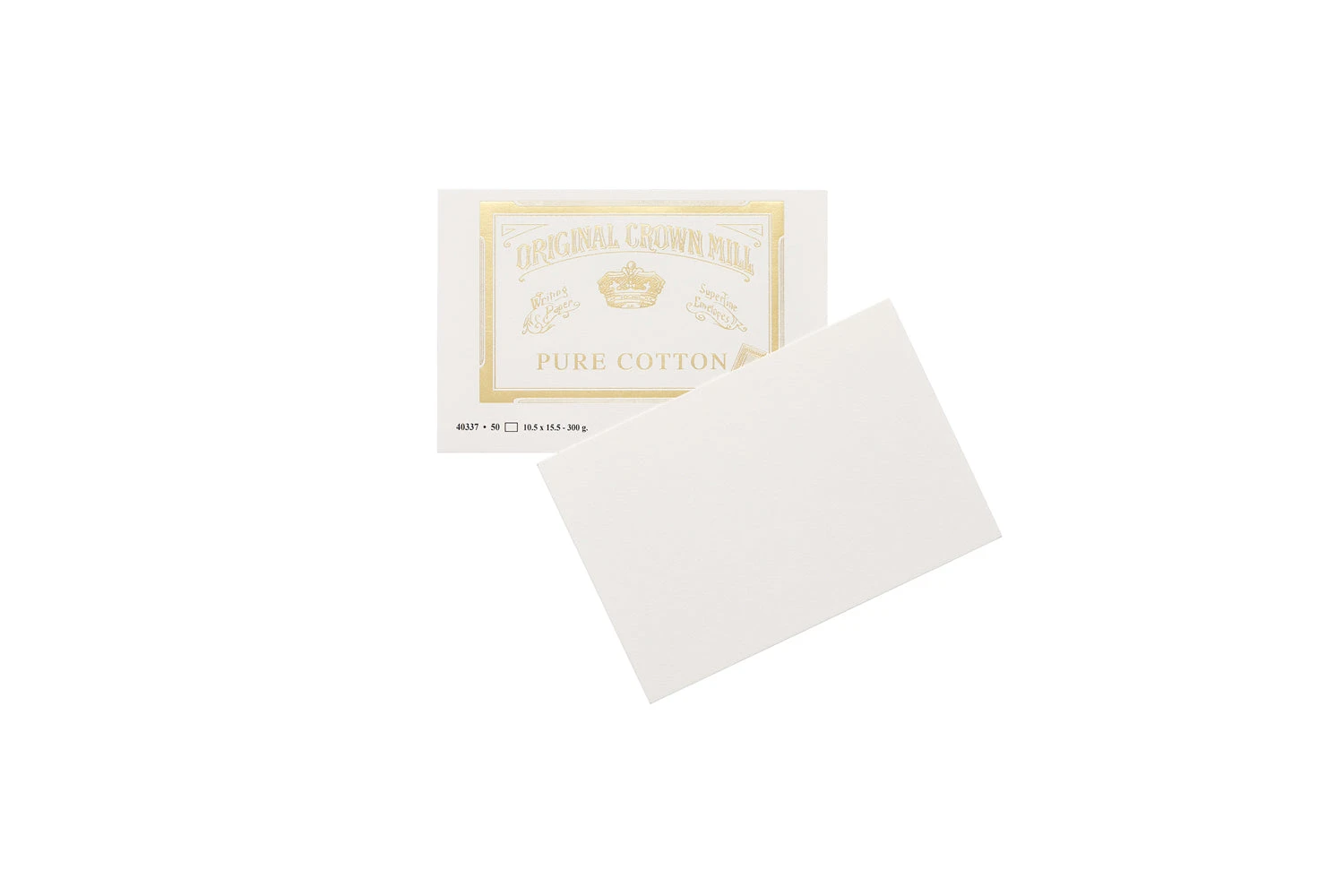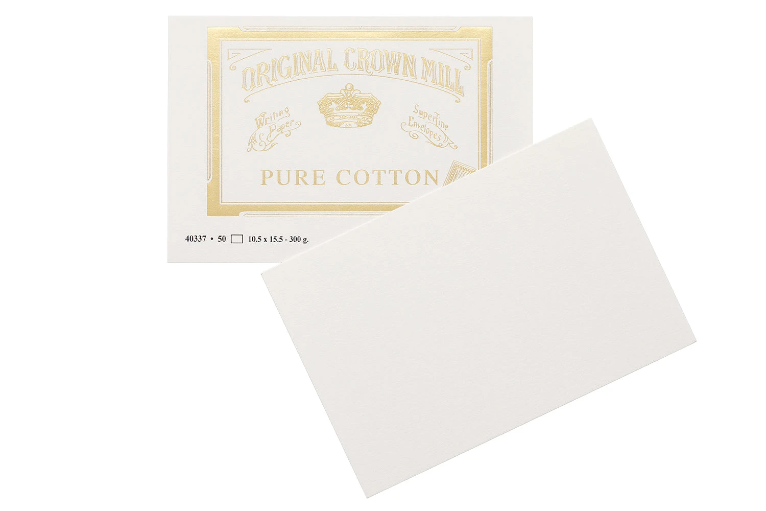 Original Crown Mill dense, 100% cotton, natural white set of 50 flat cards in size 4″ x 6″. Matching Pure Cotton envelopes are available separately in packages of 25. Made in Belgium.