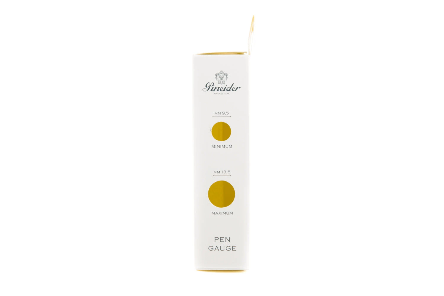 The Pineider Pen Filler will accept pens with grips that are between 9.5mm and 13.5mm. This is most pens except unusually thin or thick ones. These measurements will not measure exactly to the grip measurements we have, however. Our grip measurements are done in somewhat of an approximation of where most people might hold it (somewhere near the middle, usually), but due to the fact that most pen grips have contours or tapers to them, it is somewhat difficult to definitively say what pens will fit it and what won’t without actually trying it. Fortunately, there are two holes on the side of the outer box that you can use as a gauge to test whether your pen will fit!
