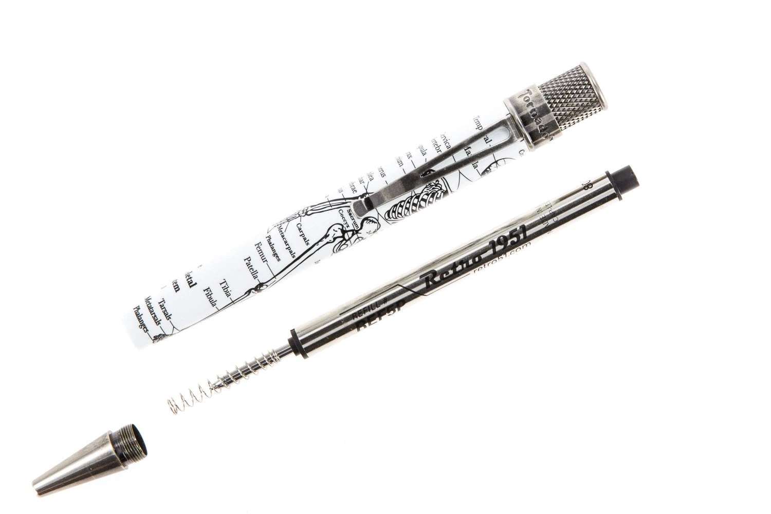 This Retro 51 Tornado rollerball pen features a glow in the dark barrel with skeleton print. It has stonewash trim. Each twist-action pen comes loaded with a black rollerball refill that flows with a medium stroke.