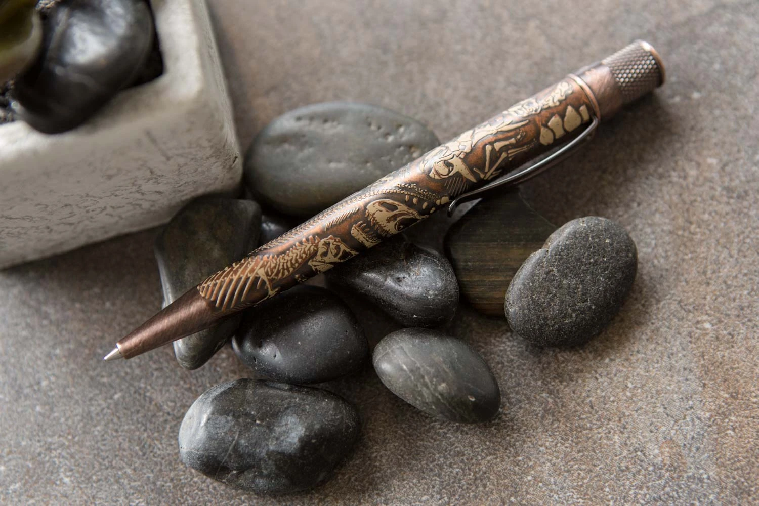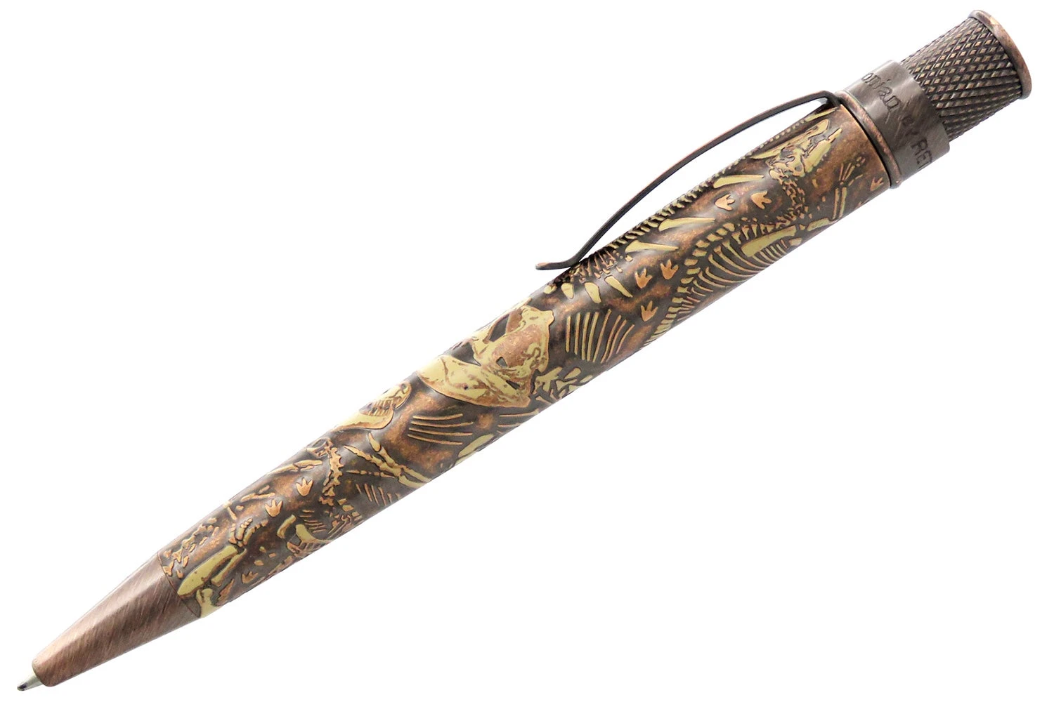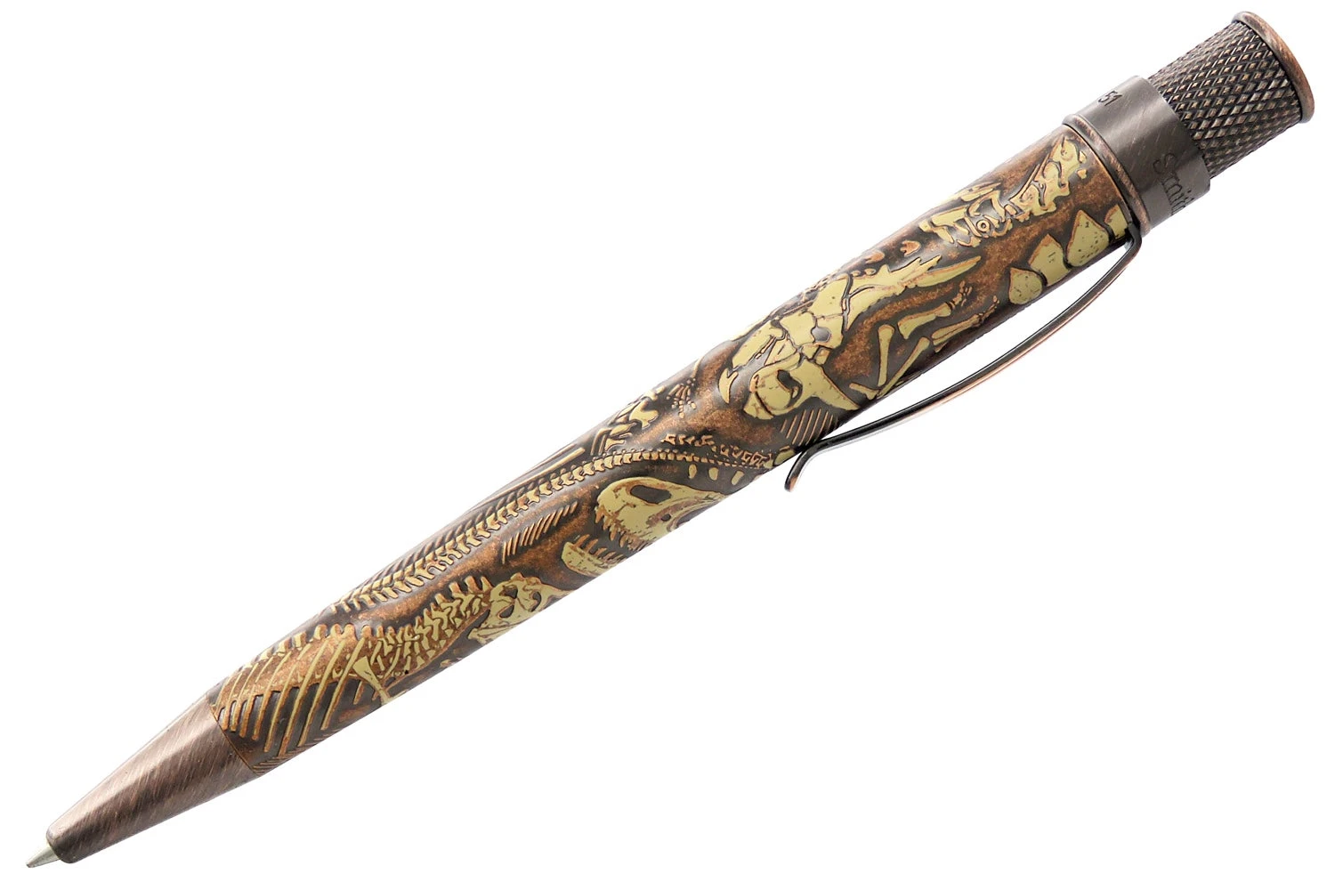 Think about someone you know that loves dinosaurs and will open this officially licensed Smithsonian Dino Fossil rollerball pen. Inside the commemorative tube they will discover a metal pen where you can actually feel the bones. It’s been plated in stonewashed copper to give it an unearthed look and finally top printed in ivory to highlight the several dinosaurs that wrap around the barrel. The top ring has been engraved with the Smithsonian name, plus it’s numbered and then imprinted with the Smithsonian logo on the top disc. This timeless twist-action rollerball pen features Retro 51’s signature knurled twist top and comes loaded with a black rollerball refill that flows with a medium stroke. It comes packaged in a matching tube. This pen is sure to make you roar!