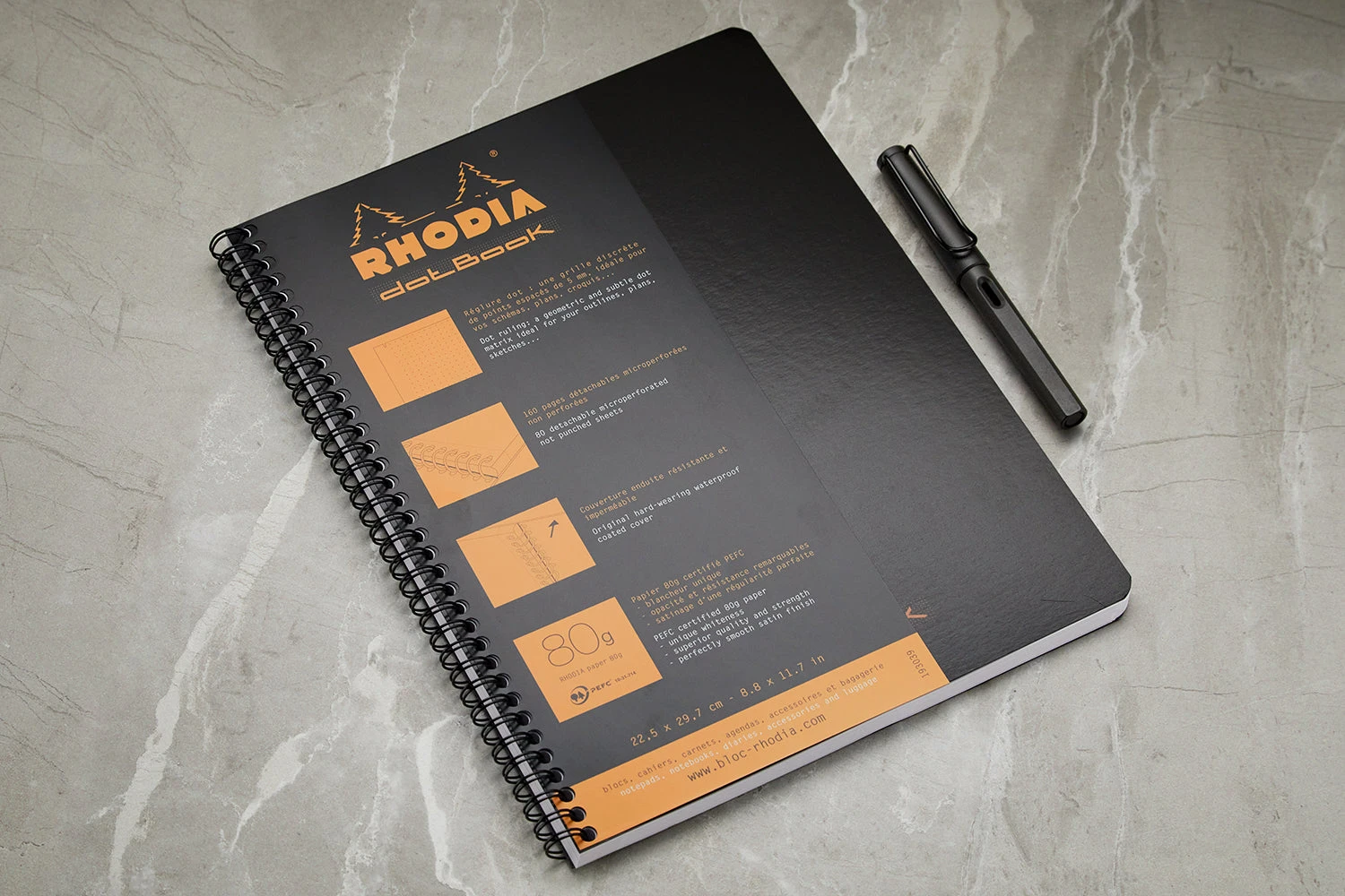 This oversized black wirebound Rhodia notebook features 80 sheets (160 pages) of extra white 80g acid-free, pH neutral dot grid paper and a coated and waterproof cover. Each sheet is microperforated for easy removal, and dots are spaced 5mm apart.