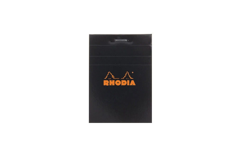 This small black Rhodia notepad features 80 sheets of extra white 80g acid-free, pH neutral lined paper. Each sheet is microperforated at the top for easy and clean removal. Lines are spaced 7mm apart. The top stapled cover folds back cleanly, and there is a hard cardboard back for writing support. These economical pads are a favorite of artists, designers, writers, and notebook fans for notes, sketching, and hand drafting. People love them for their smooth paper and iconic cover.