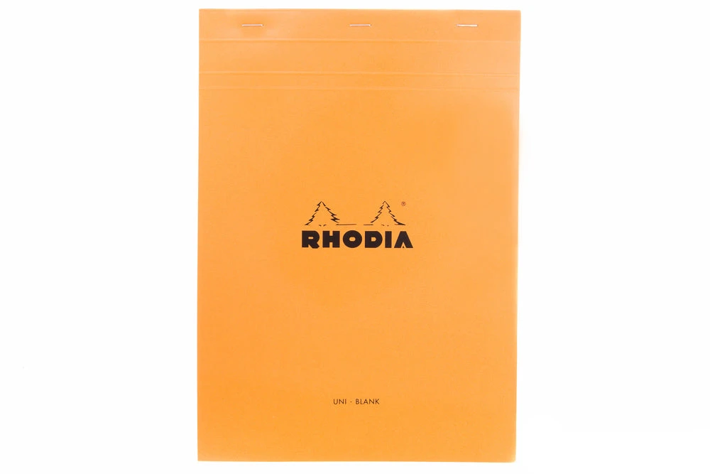 This A4-sized orange Rhodia notepad features 80 sheets of extra white 80g acid-free, pH neutral blank paper. Each sheet is microperforated at the top for easy and clean removal. The top stapled cover folds back cleanly, and there is a hard cardboard back for writing support. These economical pads are a favorite of artists, designers, writers, and notebook fans for notes, sketching, and hand drafting. People love them for their grids, smooth paper, and iconic cover.