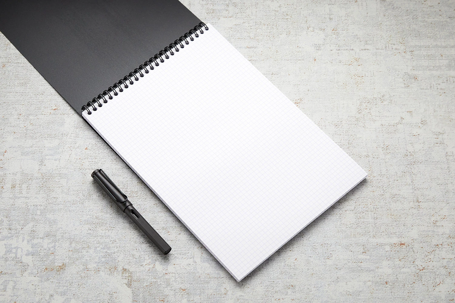 This A4-sized black Rhodia top wirebound notepad features 80 sheets of extra white 80g acid-free, pH neutral 5mm graph paper. Each sheet is microperforated at the top for easy and clean removal. There is a hard cardboard back for writing support. These economical pads are a favorite of artists, designers, writers, and notebook fans for notes, sketching, and hand drafting. People love them for their grids, smooth paper, and iconic cover.