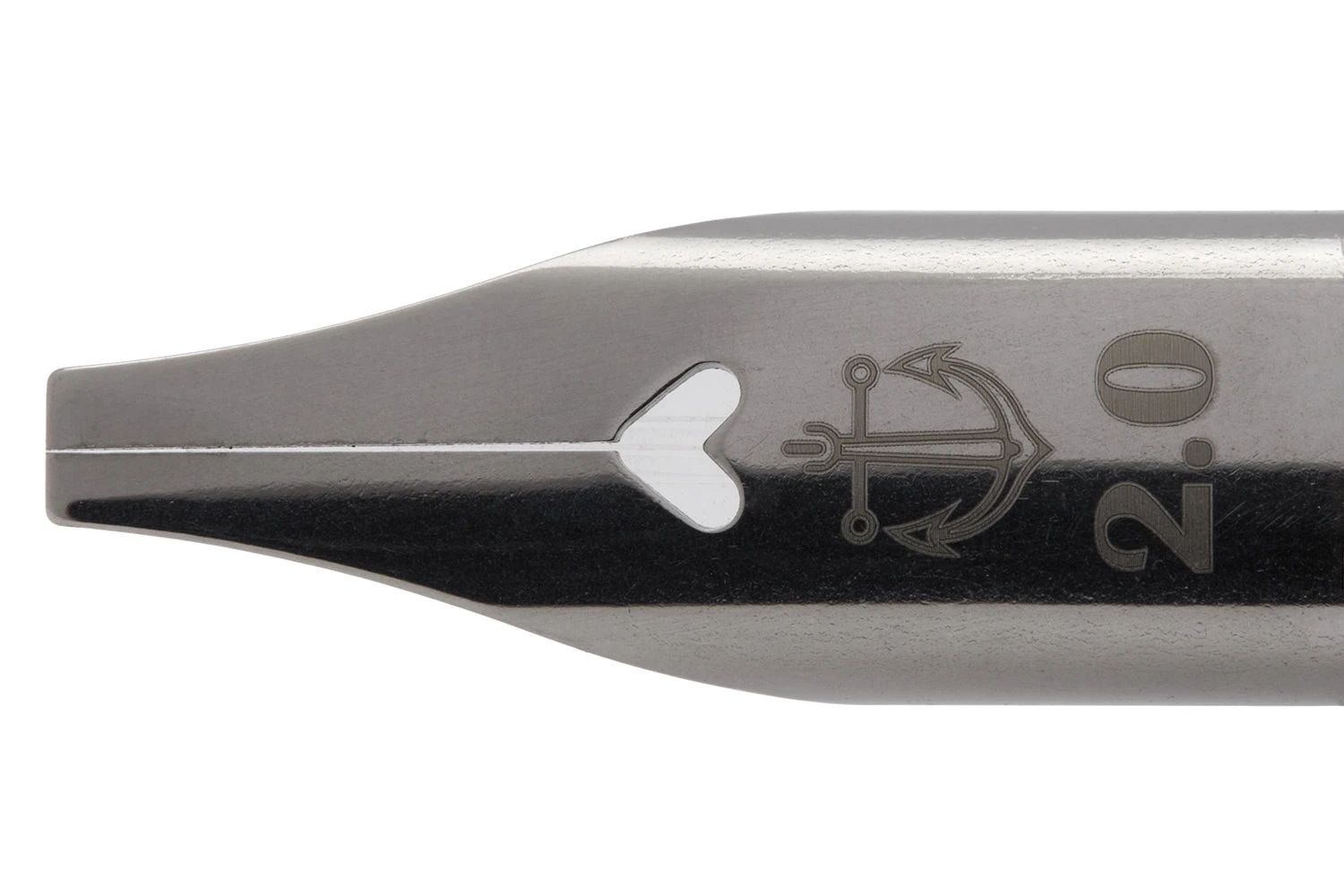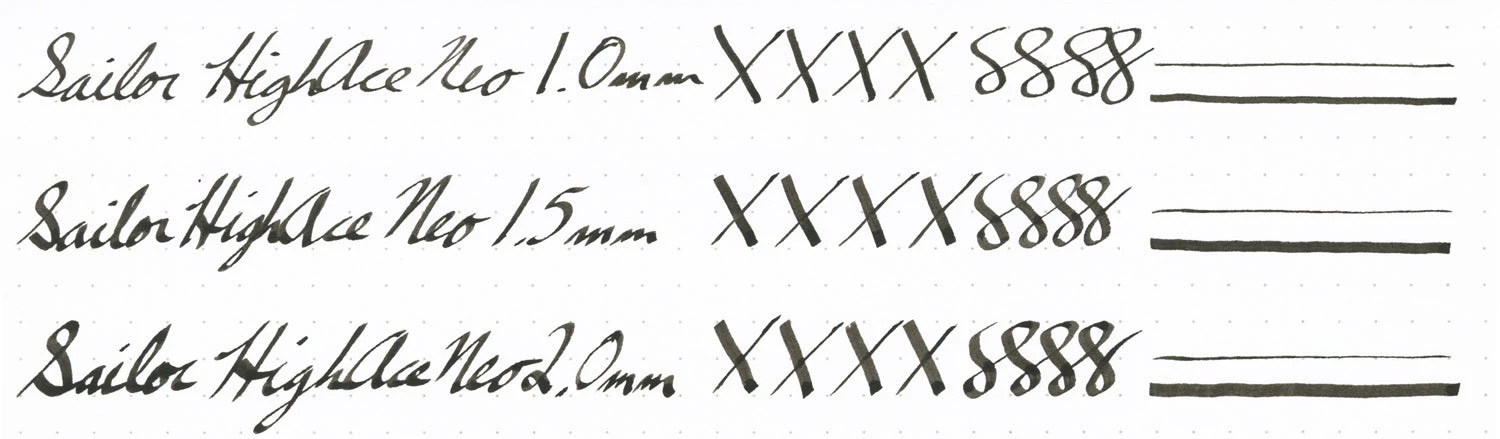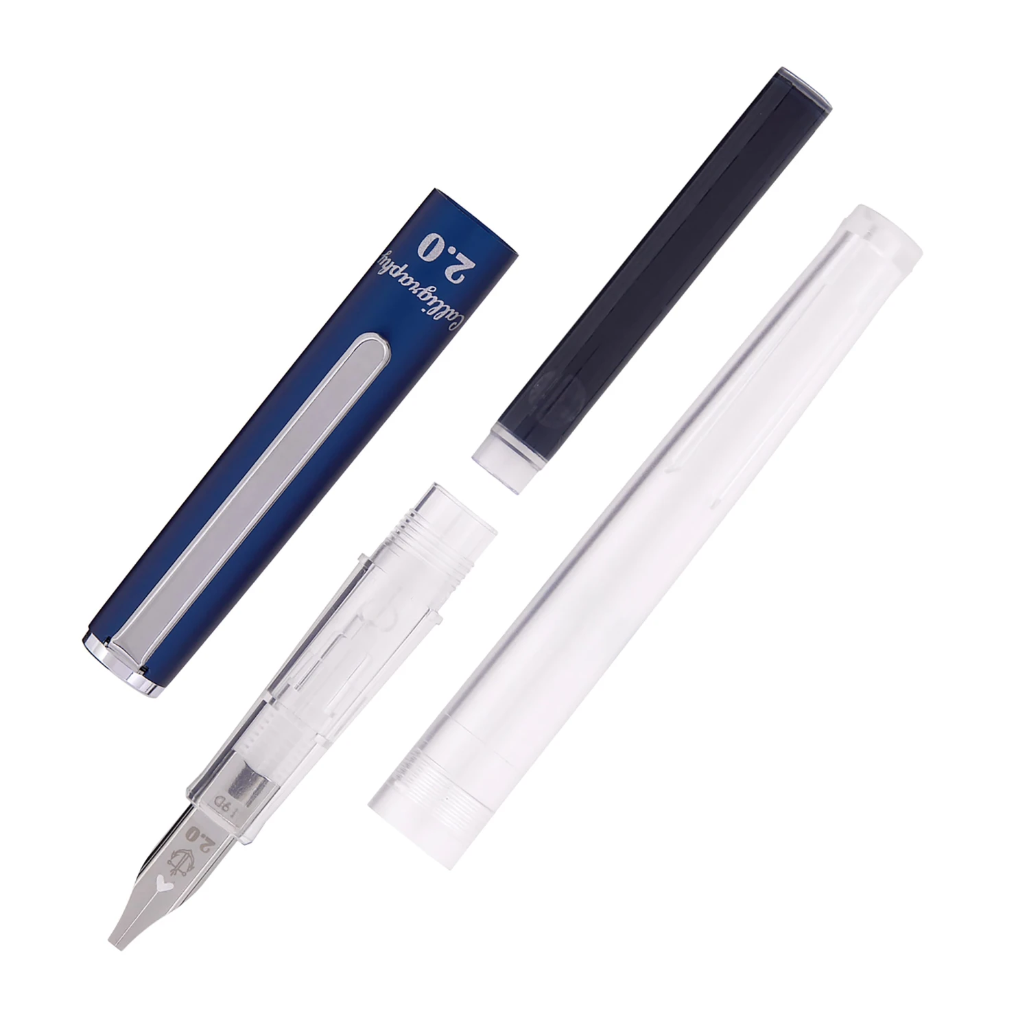 This Sailor Compass HighAce Neo calligraphy fountain pen has a transparent clear resin body, a blue cap, a clear feed, and silver trim. It comes with a stainless steel nib available in three stub italic nib sizes. Each pen comes with three proprietary Sailor Black ink cartridges; you can also purchase a Sailor converter separately to use bottled ink.