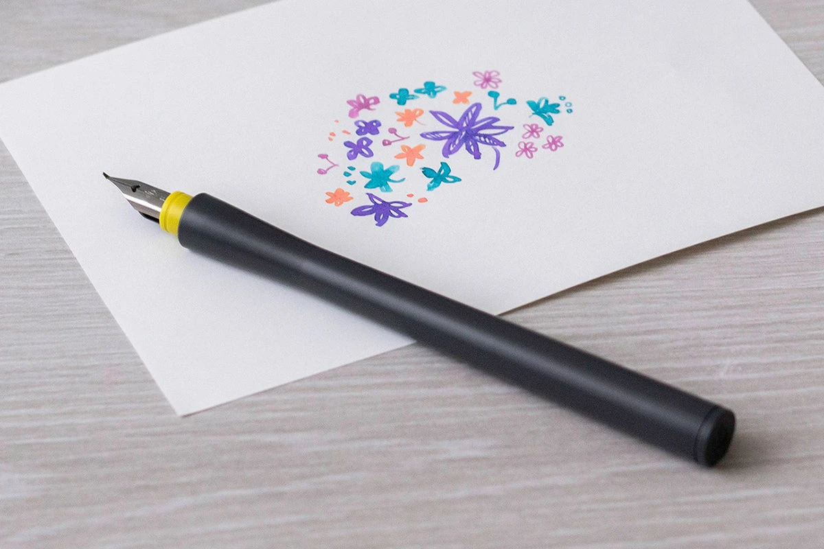This pen comes with a gray barrel and a Fude steel nib with a yellow accent. An attachable ink reservoir is included.
