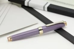 The Sailor Pro Gear Slim fountain pen is equipped with a 14k gold nib in fine, medium fine, or medium. The cap screws to open/close and can push to post onto the back of the barrel when writing. Each pen comes with a proprietary Sailor converter.