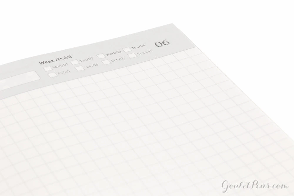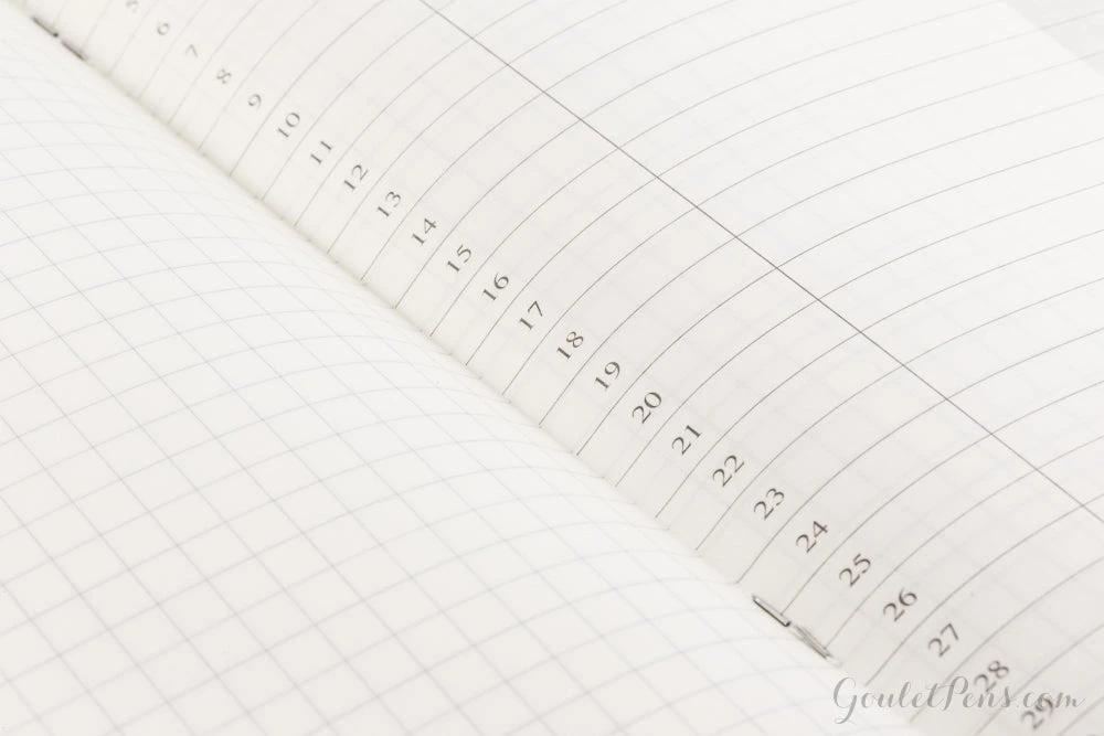 This refill for the regular size Traveler’s Notebook measures 11cm x 21cm (approximately 4.33in x 8.25in), and contains 32 sheets (64 pages) of ivory fountain pen friendly Midori MD paper. The binding is stitched, and it contains two months’ portion of monthly list pages and page-a-day diary. This travel diary can also record what you encounter and experience every day in your journey through life. Also, it contains numbers 1 through 31, with which you can create a ranking list of books you read, your favorite restaurants, etc.