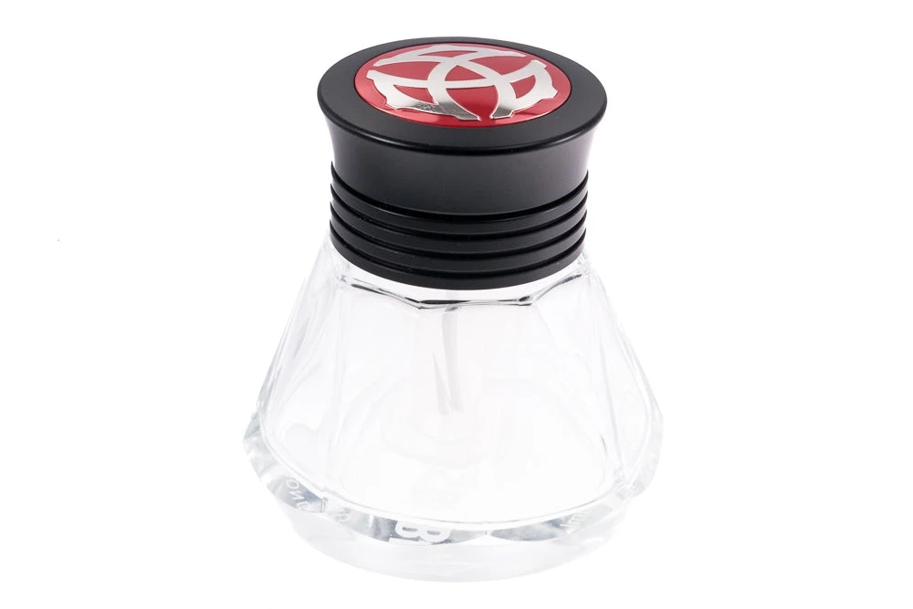 This glass inkwell from TWSBI has a black anodized aluminum top with black accents. It has an ink capacity of approximately 50ml.