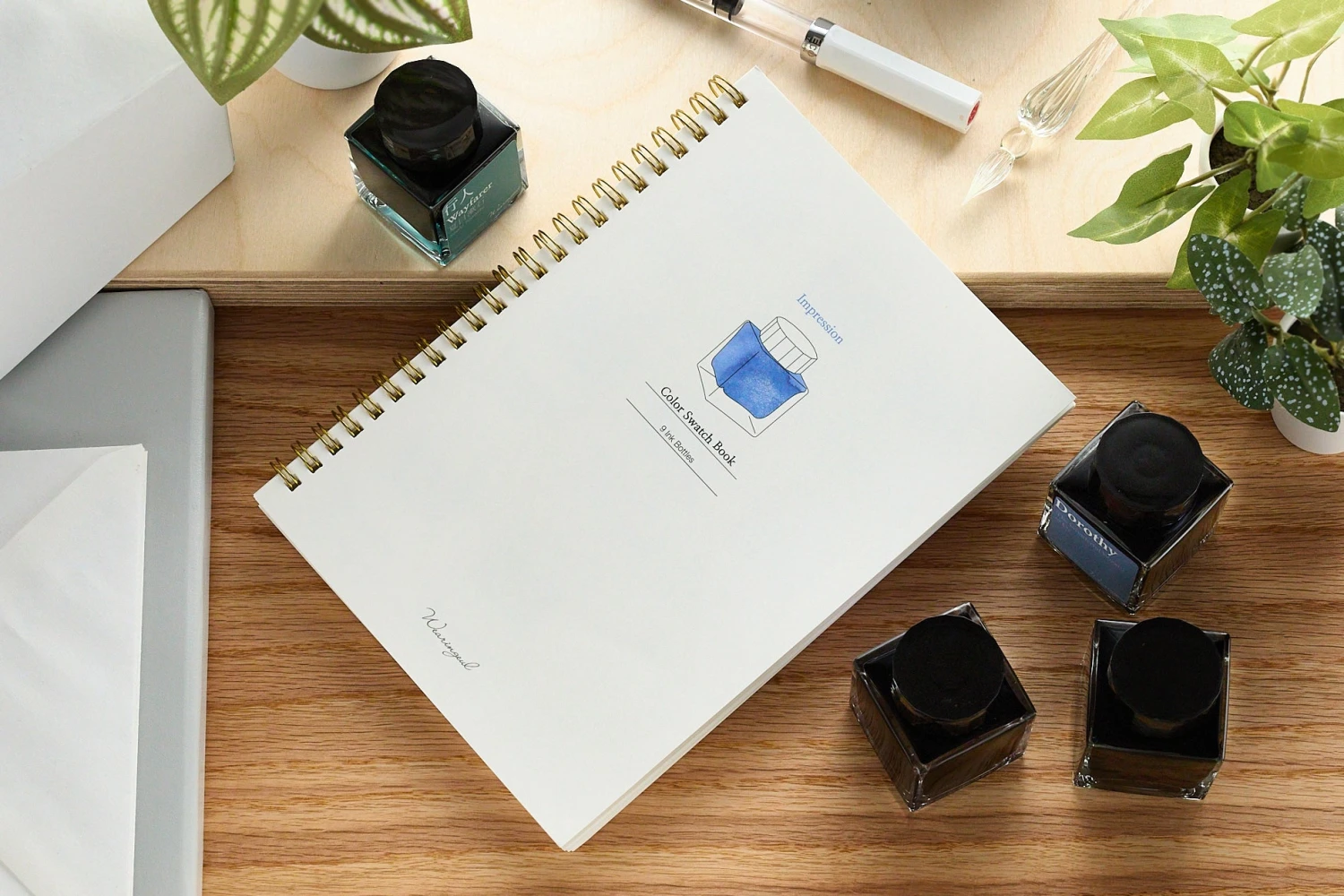 This A5 notebook is great for cataloging your favorite fountain pen colors! The paper is Wearingeul’s Impressions paper with a weight of 200g/m². Each sheet has nine bottle images with two lines underneath so you can write the ink name below the bottle image.